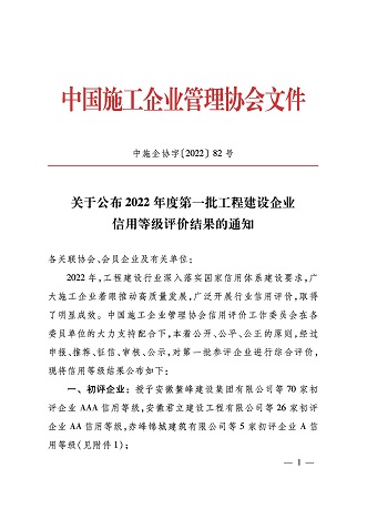 2022年,黃山市建工集團股份有限公司再次榮獲施工企業(yè)最高信用評級“AAA級企業(yè)信用證書”。這是對黃山市建工集團股份有限公司持續(xù)積累的經(jīng)營管理能力、合同履約能力、市場競爭能力及優(yōu)質(zhì)社會形象的權(quán)威認證。