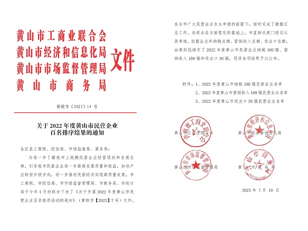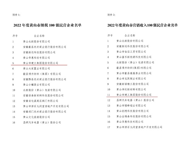 日前,由黃山市工商聯(lián)、市經(jīng)信局、市監(jiān)管局及市商務(wù)局聯(lián)合發(fā)布2022年度黃山市民營(yíng)企業(yè)納稅及營(yíng)銷(xiāo)收入百?gòu)?qiáng)名單公布,黃山建工集團(tuán)連續(xù)多年再次實(shí)力入圍,獲此殊榮!
