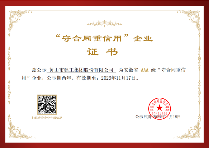 近日,黃山建工集團(tuán)憑借健全的信用管理體系、優(yōu)良的合同履約信用狀況和良好的市場(chǎng)信譽(yù)榮獲安徽省AAA級(jí)“守合同重信用”企業(yè)稱號(hào)。這一榮譽(yù)的獲得,不僅是對(duì)黃山建工集團(tuán)在企業(yè)經(jīng)營(yíng)過程中始終堅(jiān)持誠信經(jīng)營(yíng)的肯定,也是對(duì)黃山建工集團(tuán)在合同履行和信用管理方面所取得的顯著成績(jī)的認(rèn)可。