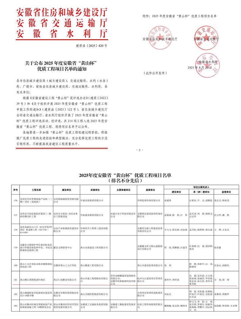 近日,安徽省住房和城鄉(xiāng)建設廳、安徽省交通運輸廳、安徽省水利廳聯(lián)合公布了2025年度省“黃山杯”優(yōu)質工程項目名單,黃山市建工集團承建的黃山橫江灣凱悅嘉軒酒店項目成功入選,榮膺安徽省建設工程質量最高榮譽——“黃山杯”獎。